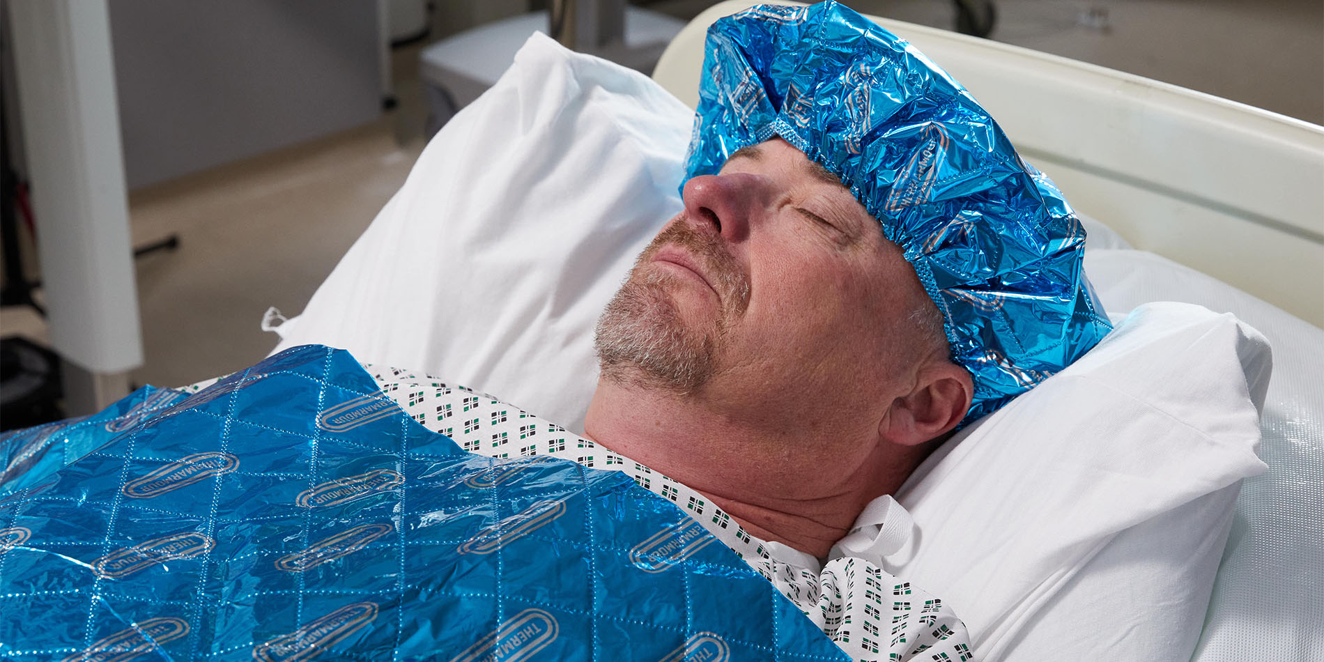 Thermarmour Medical Hypothermia Cap for elective surgery. One size fits all using latex-free elastic. Reduces patient’s heat loss through the head throughout the perioperative period.